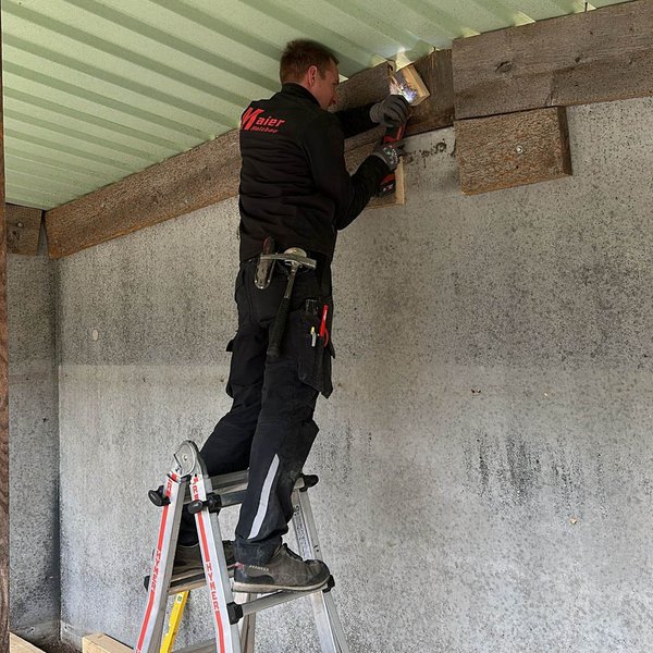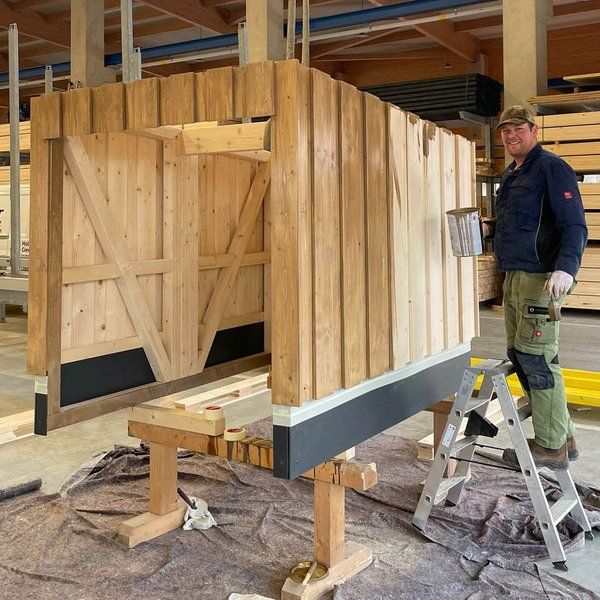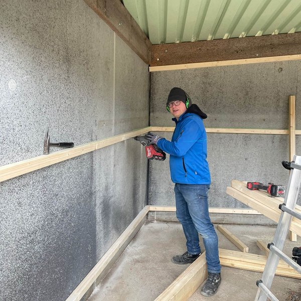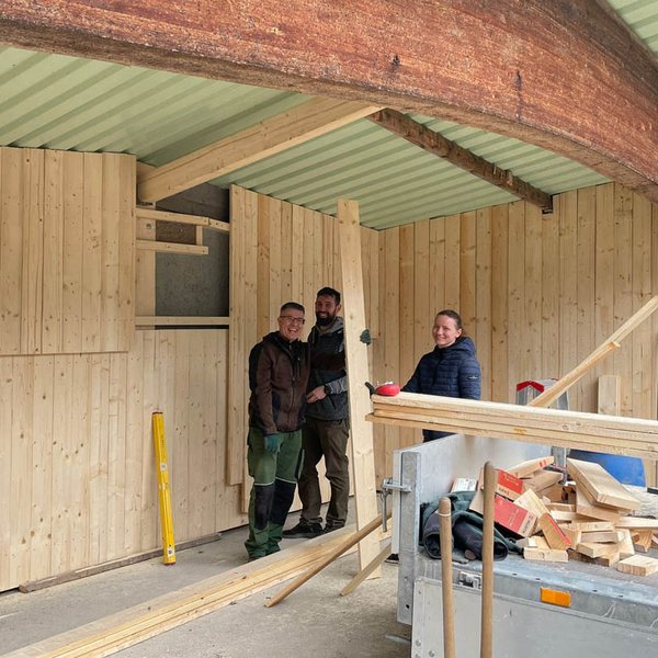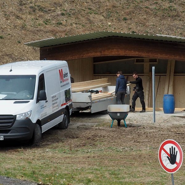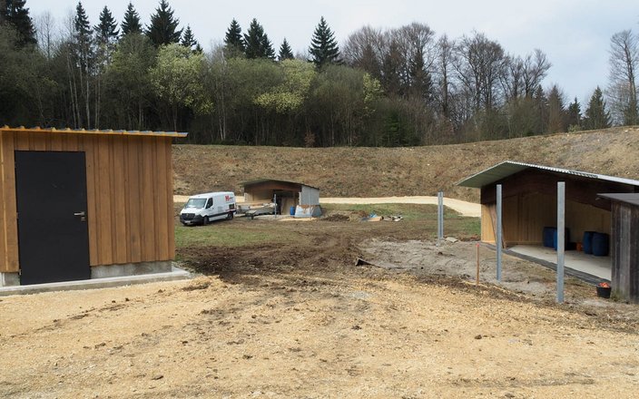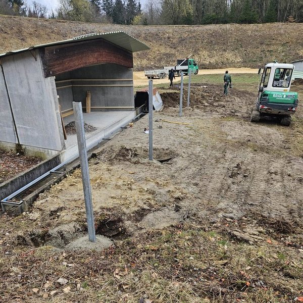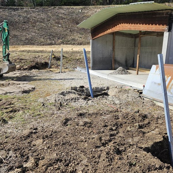 Die Sanierung des Schießstands in Oggenhausen schreitet stetig voran, da mittlerweile auch unter der Woche daran gearbeitet wird. Nachdem in der letzten Woche die U-Stahleisen für die Prallschutzwände gesetzt und einbetoniert wurden, lag der Fokus am Wochenende auf dem Kipphasen. Hier wurden sämtliche Bretter auf der Unterkonstruktion angebracht und die neue Hütte direkt mit einem sorgfältigen Schutzanstrich versehen. Als nächster Schritt ist für die kommende Woche die Bestellung des Vlieses für die Hangabdeckung geplant.