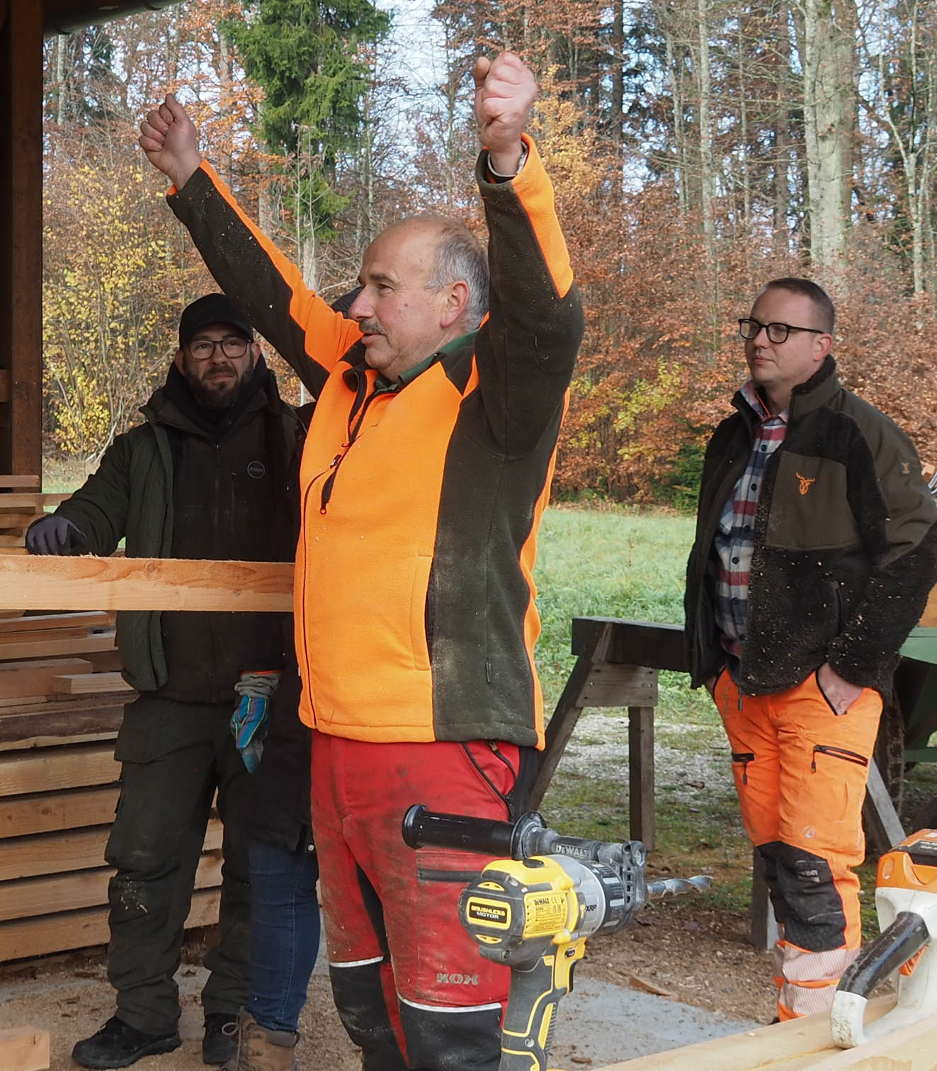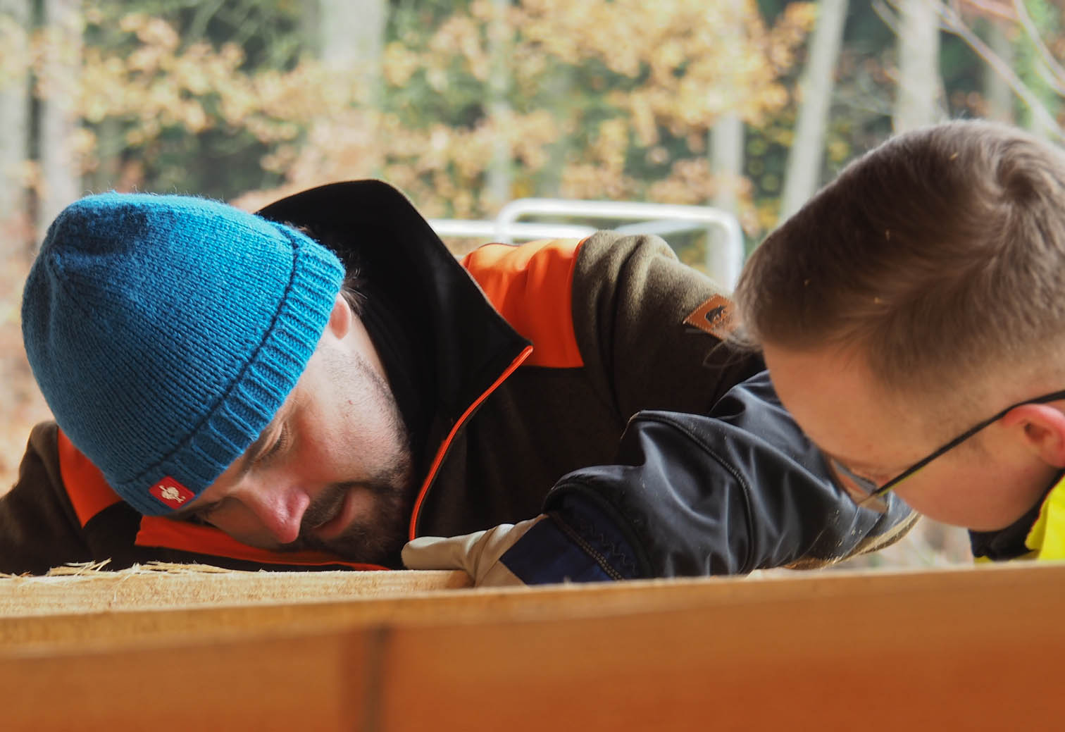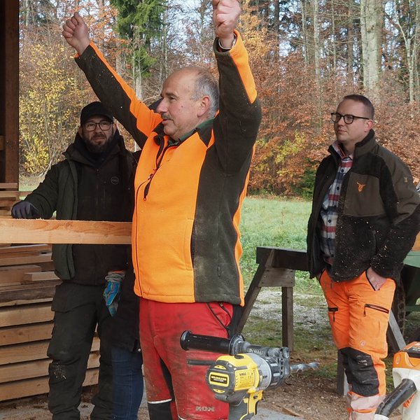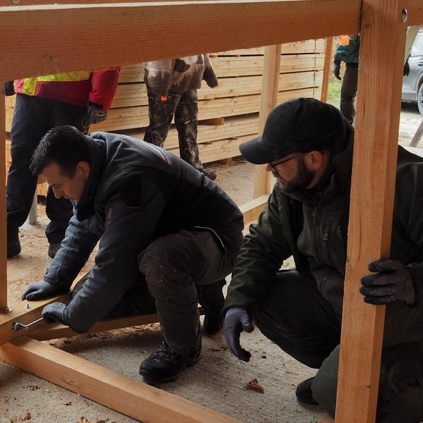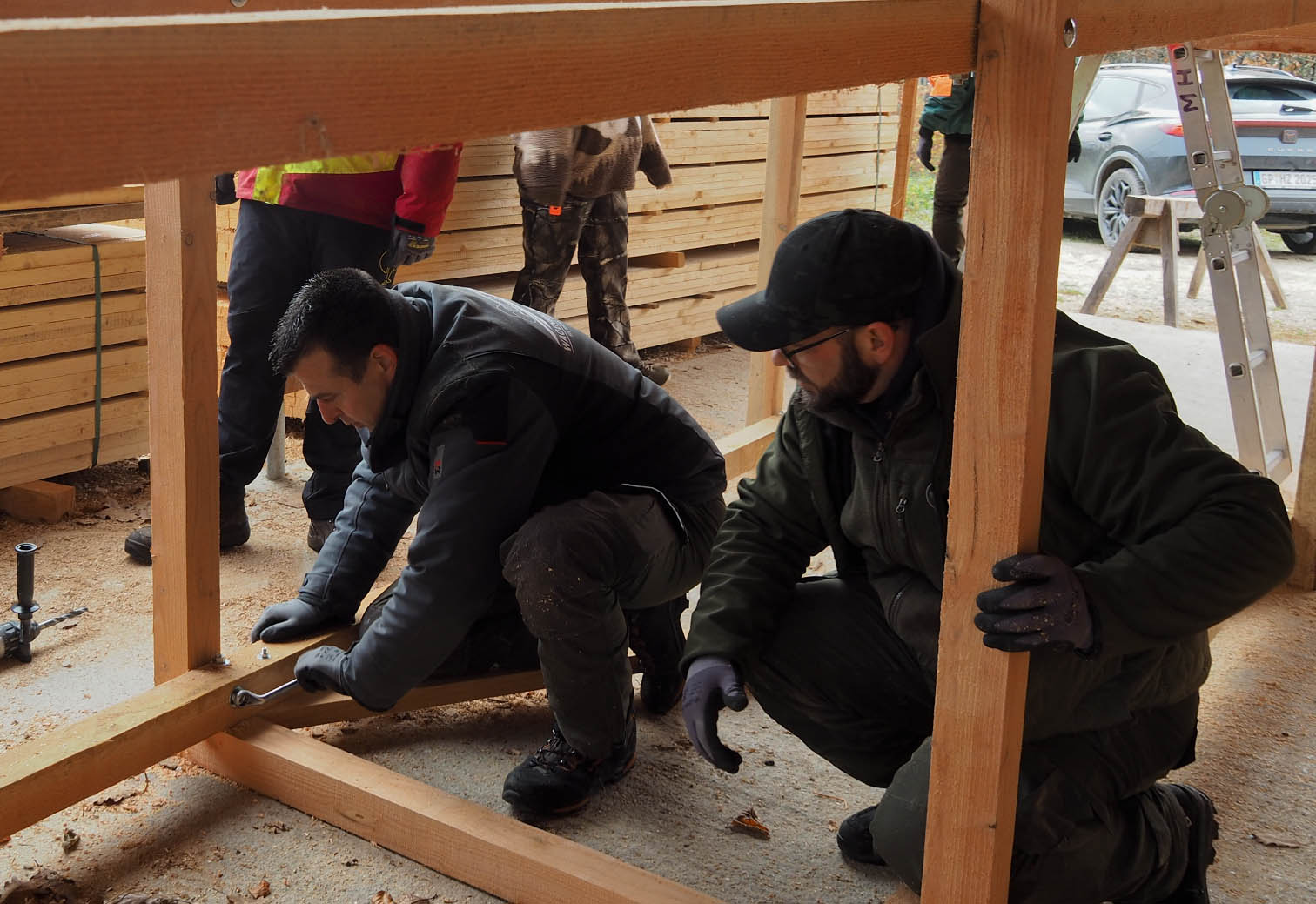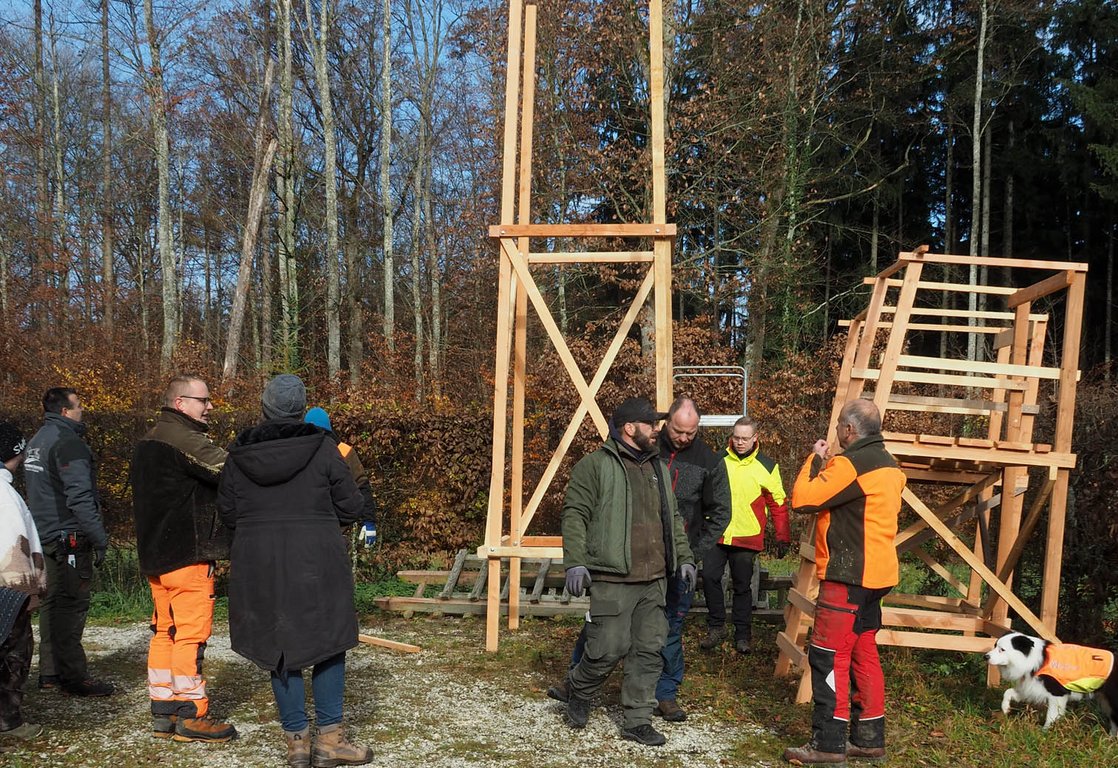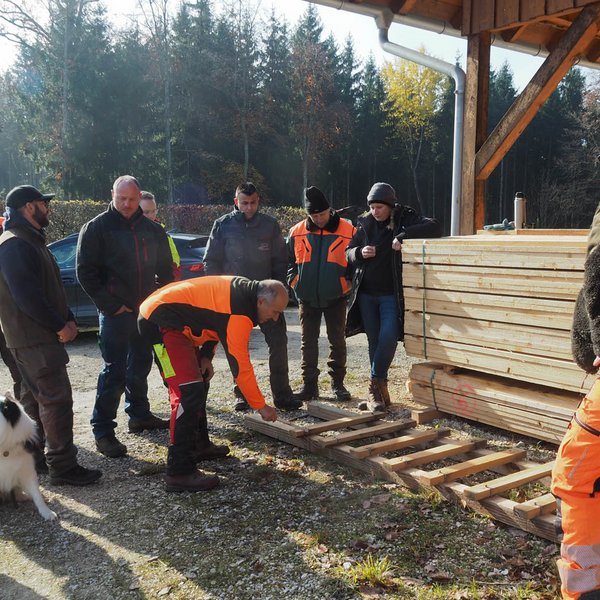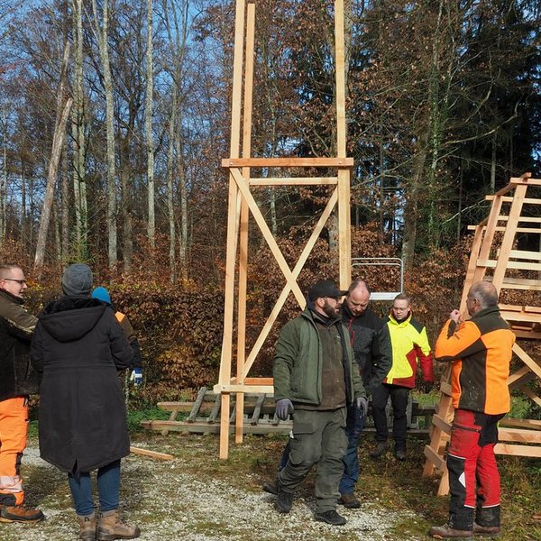 Der Unterricht begann mit den Grundlagen: von der Notwendigkeit jagdlicher Einrichtungen und den Standort-Anforderungen über die rechtlichen Aspekte bis hin zur Einhaltung der Vorschriften der Berufsgenossenschaft (BG). Anschließend ging es an die konkrete Umsetzung: Es wurde ein solides, drei Meter hohes Kanzelgestell gebaut. Hierbei waren präzises Vermessen, Sägen undSchrauben gefragt, gefolgt vom Bau einer passenden Leiter mit korrektem Sprossenabstand.