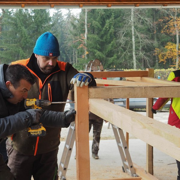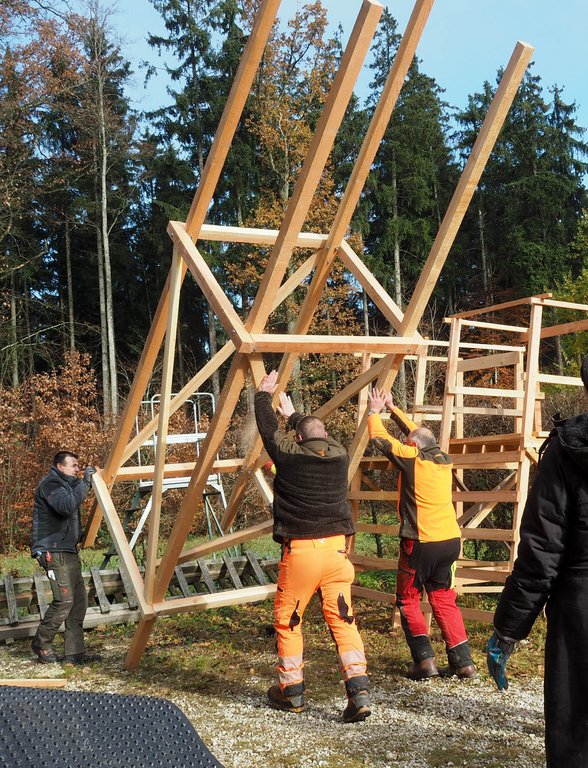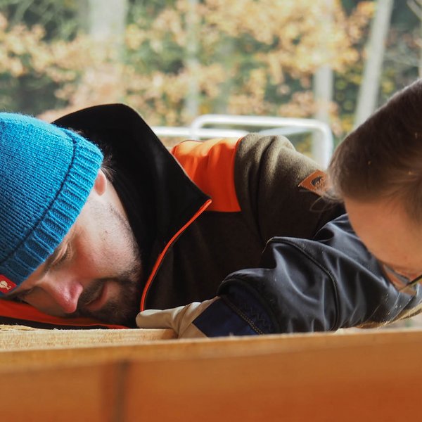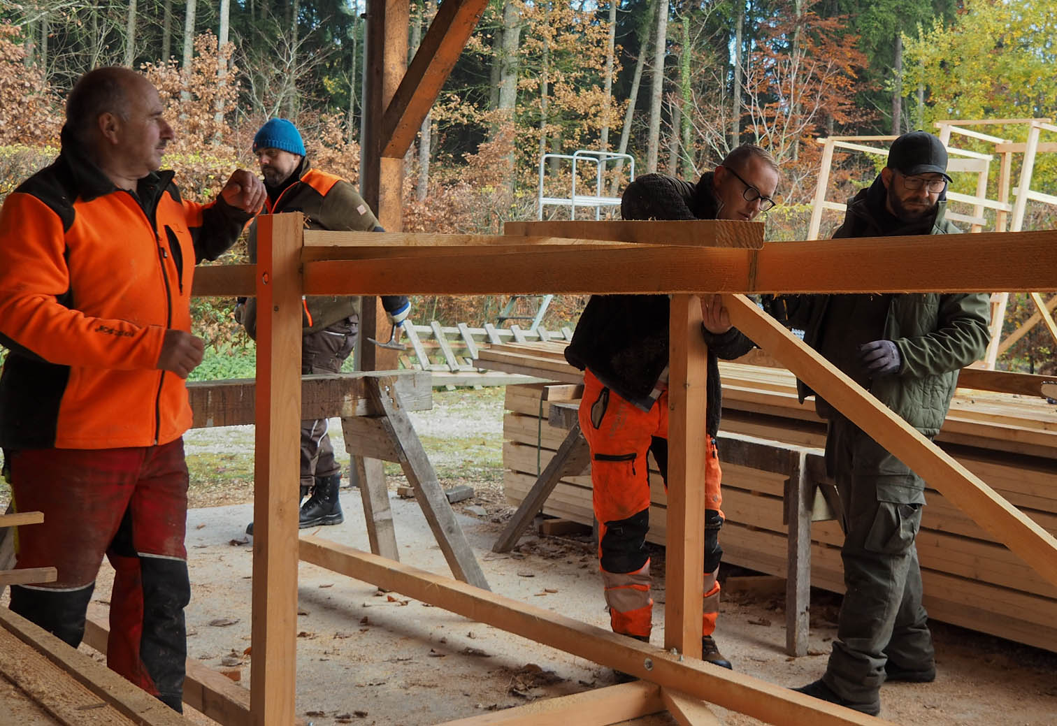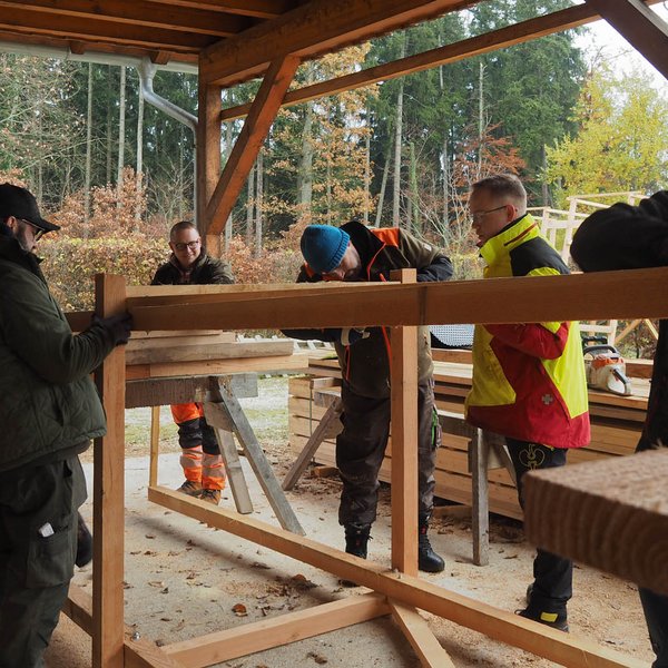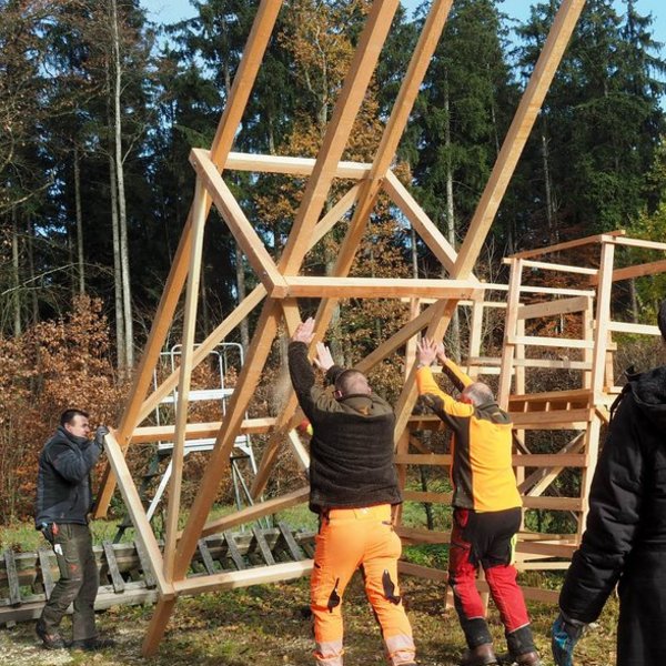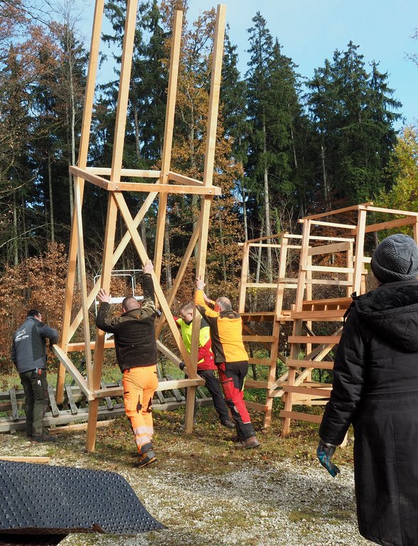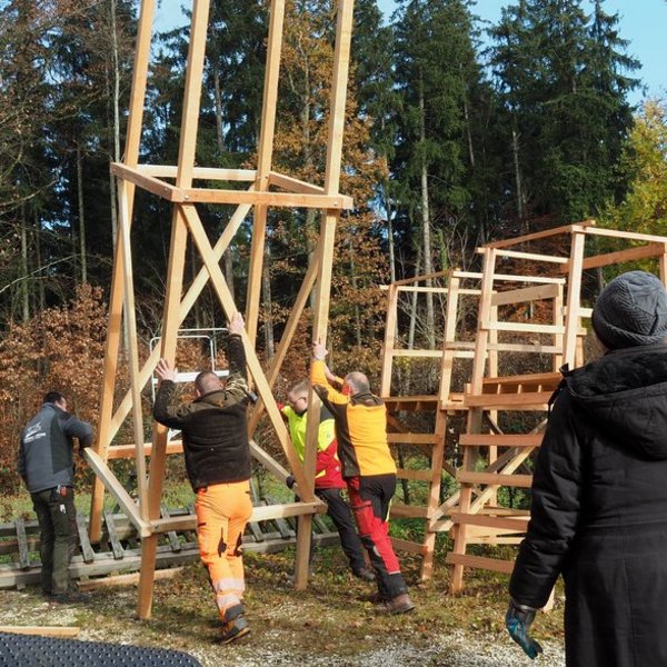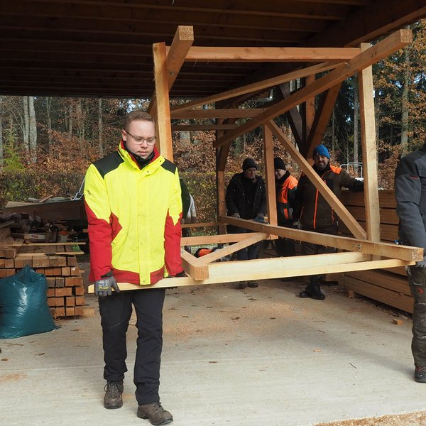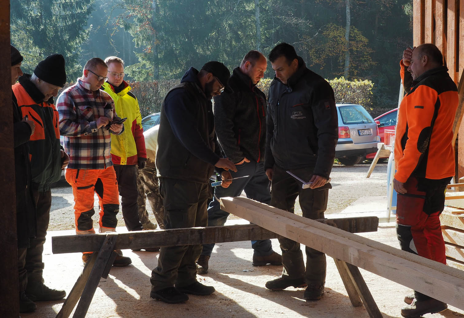 Der Unterricht begann mit den Grundlagen: von der Notwendigkeit jagdlicher Einrichtungen und den Standort-Anforderungen über die rechtlichen Aspekte bis hin zur Einhaltung der Vorschriften der Berufsgenossenschaft (BG). Anschließend ging es an die konkrete Umsetzung: Es wurde ein solides, drei Meter hohes Kanzelgestell gebaut. Hierbei waren präzises Vermessen, Sägen undSchrauben gefragt, gefolgt vom Bau einer passenden Leiter mit korrektem Sprossenabstand.