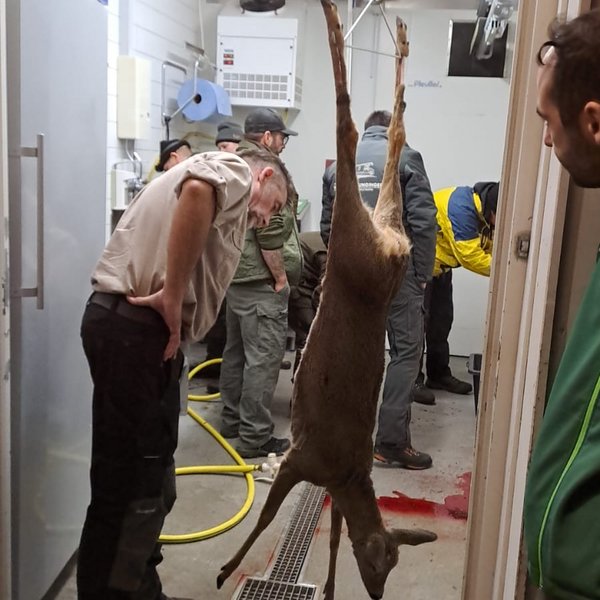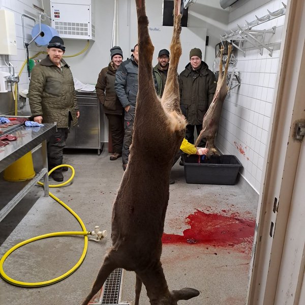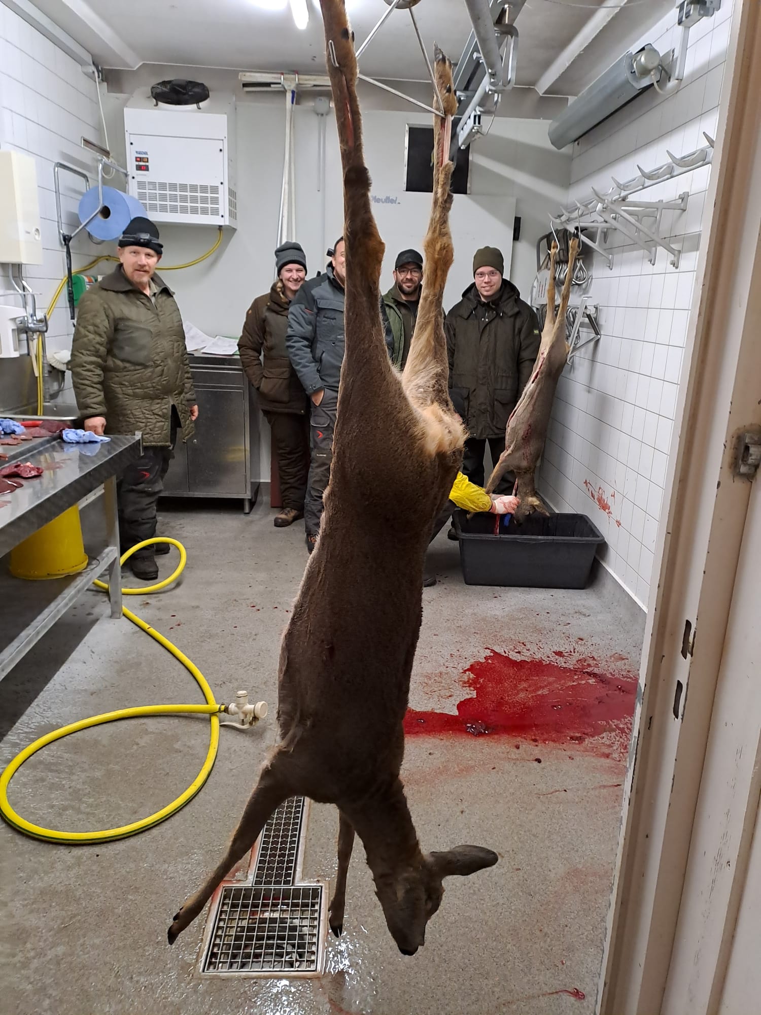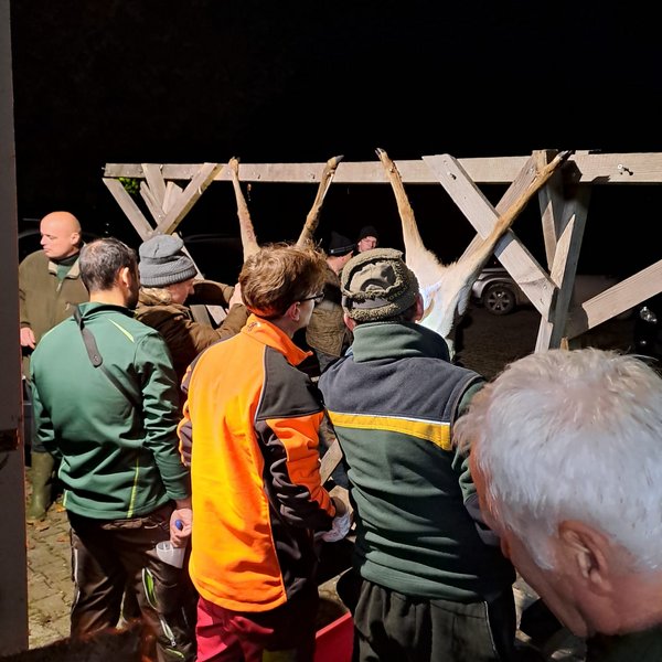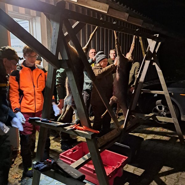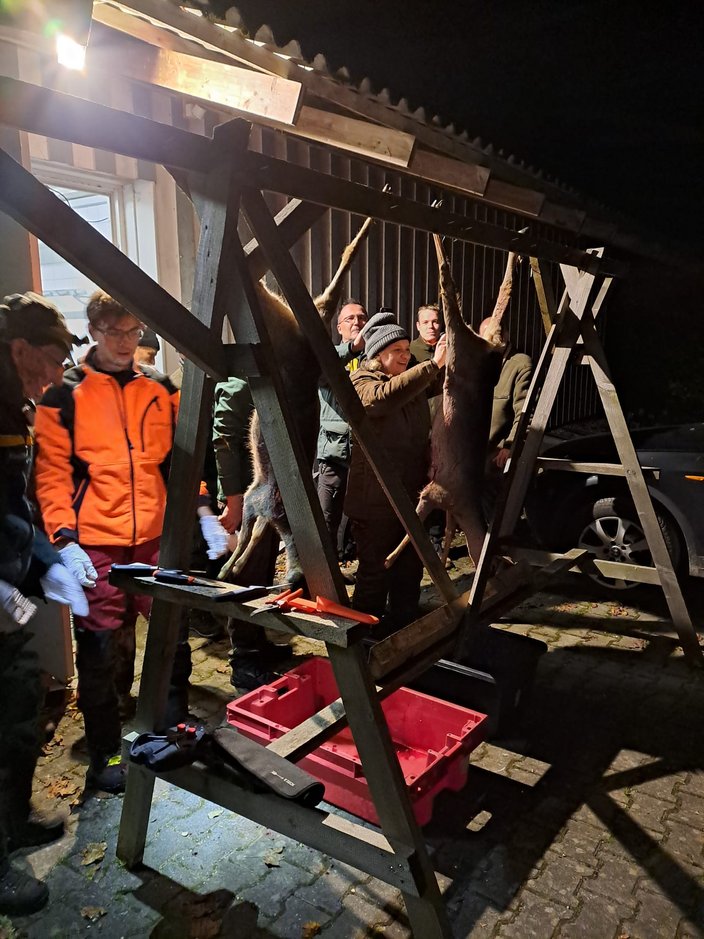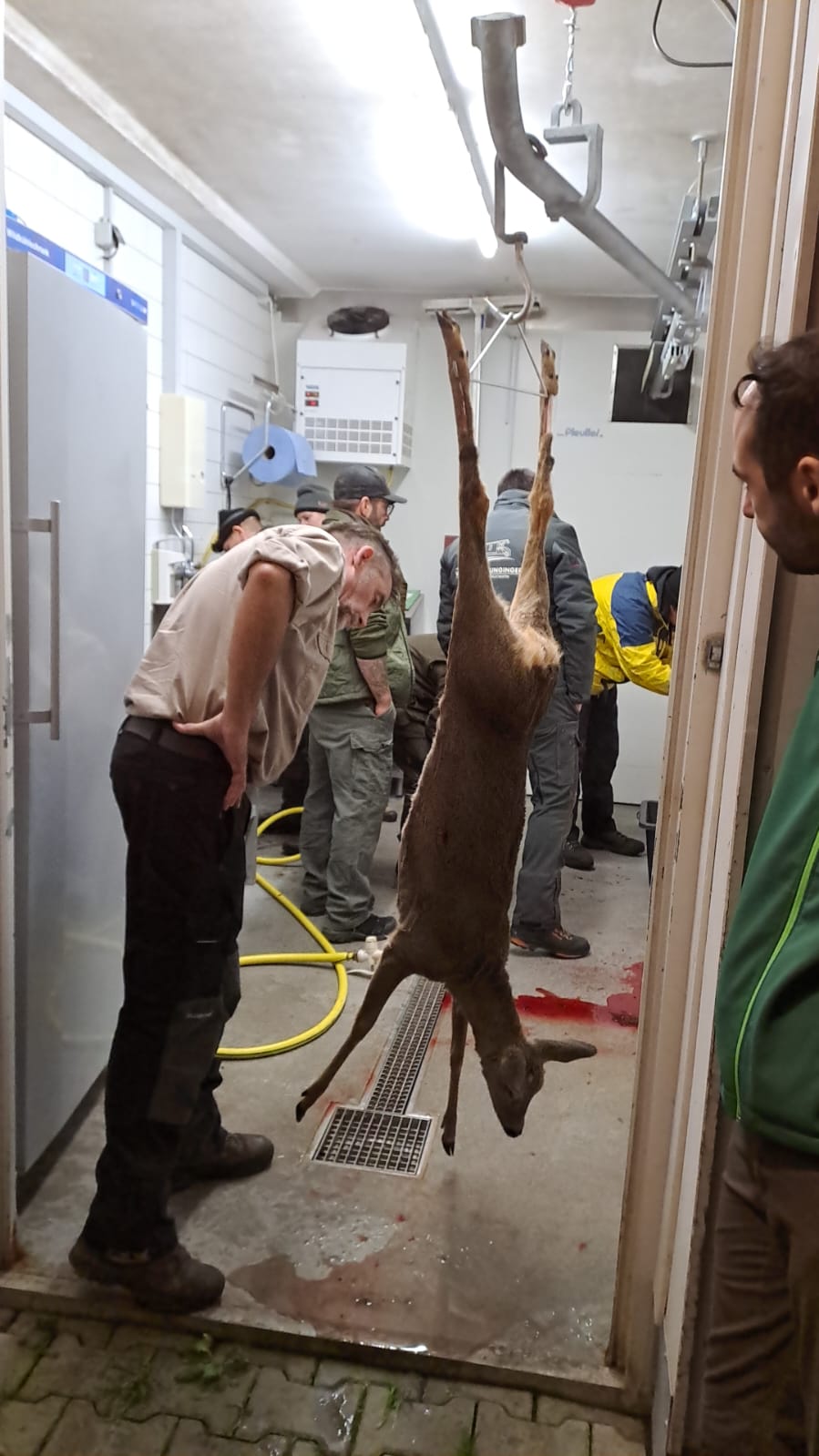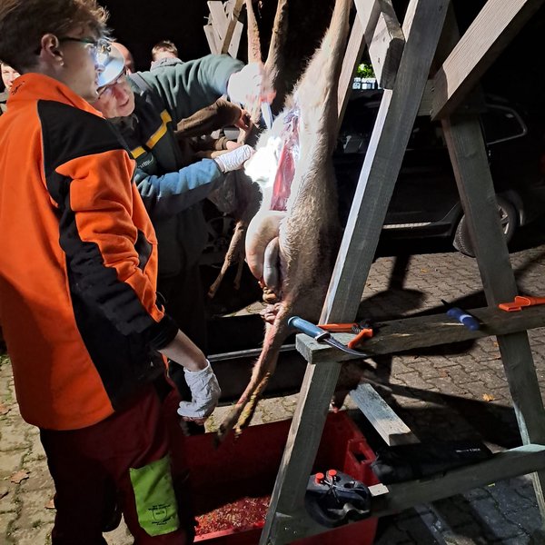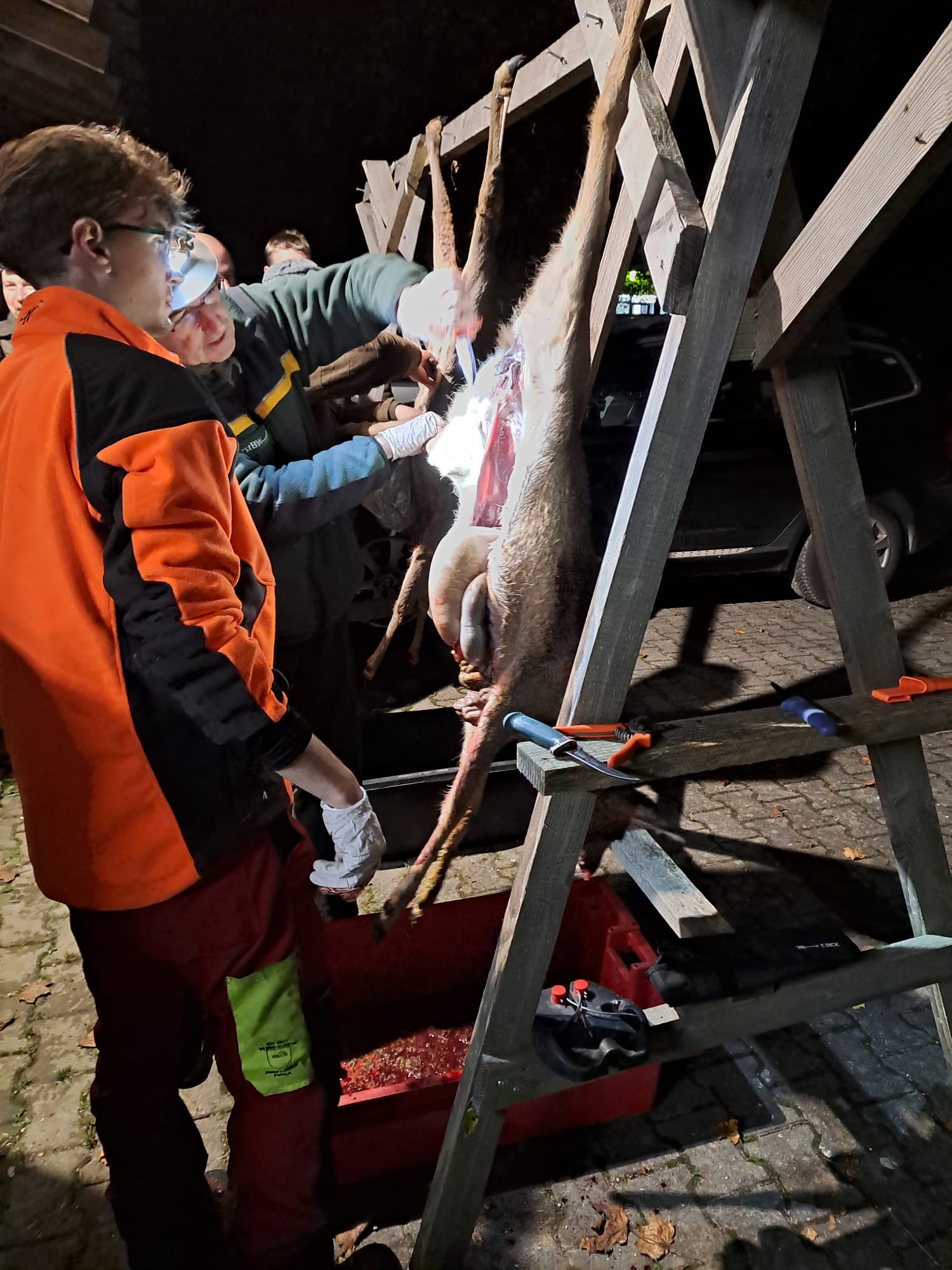 Das Lernen war mit dem Schuss nicht beendet. In der Wildkammer ging die praktische Ausbildung unter fachkundiger Anleitung weiter. Die Jungjäger konnten beim Aufbrechen des erlegten Wildes selbst mit anpacken und dabei Fertigkeiten für die Wildbrethygiene lernen. Dies schloss auch die anschließende Reinigung der Wildkammer mit ein – gelebte Verantwortung und praktische Wildbrethygiene.