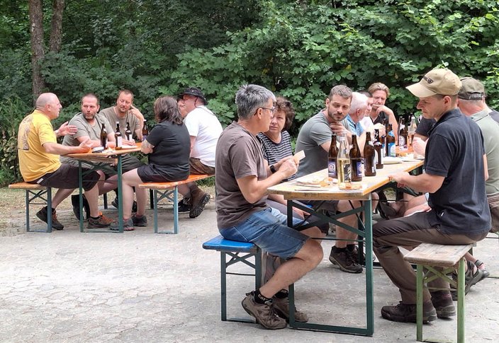 Ein kleiner, aber feiner und gemütlicher Frühschoppen fand am Sonntagmorgen bei der Hochberghütte statt, begleitet von leckeren Weißwürsten. Das Wetter spielte mit: Bei bedecktem Himmel wurde es nicht zu warm, sodass man gut bis in die Mittagsstunde sitzen konnte. An Gesprächsstoff mangelt es Jägern ja nie – und es gäbe wohl überhaupt weniger Probleme, wenn man mehr miteinander reden würde. Herzlichen Dank an Hegeringleiter Wolfgang Hieber für die freundliche Bewirtung!"