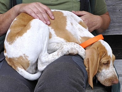 13 Wochen alt ist der kleine Kerl, der zusammengerollt im Arm der Jägerin selig schläft. Erst seit ein paar Tagen ist er in Heidenheim. Über einen Bericht in "Wild und Hund" ist die Jägerin auf diese seltenen Jagdhundrasse gekommen. "Eine Schlaftablette - aber auf der Jagd ein Ferrari", heißt es. Man wird sehen. Im Moment interessiert sich "Flora" - so der Name der kleien Hundedame - fast ausschließlich für Fressen und Schlafen.Im Anhang befindet sich eine ausführliche Beschreibung des Bracco Italiano
