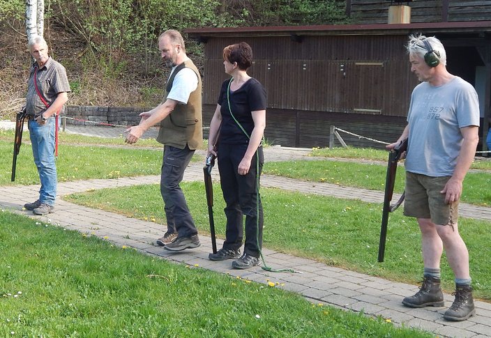 Nicht jeder Hundeführer ist auch ein versierter Flintenschütze. Der Umgang mit der Flinte ist an der Prüfung beim Standtreiben aber sehr wichtig und entscheident. Deshalb war die Einweisung durch Wolfgang Schlierer am Montag Abend auf dem Schrotstand in Oggenhausen äußerst gut und wichtig. So wie es an der Prüfung aussehen soll wurde geübt: der Hund sitzt ruhig beim Schützen, hat genügend Leine, der Schuss wird nach oben abgegeben, die Flinte, wenn das Treiben vorbei ist, abgeknickt. Die Hundekurse der vergangenen Jahre hatten gezeigt, dass diese Einweisung notwendig ist, auch für die Sicherheit aller.