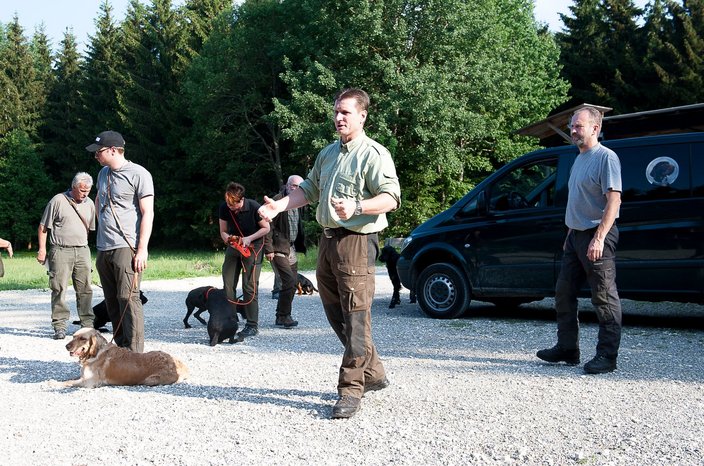 Bei der Freiverlorensuche wird das "Federwild im Gelände mit Deckung mindestens 30 Meter vom Hund entfernt ausgelegt, wobei der Hund weder das Auslegen noch das Stück eräugen darf.." Die geforderte Deckung ist dabei oft das hohe Gras, in das manche Hunde nicht ohne weiteres gehen mögen. Genau dafür gabs für alle sowohl am Donnerstag, als auch am Samstag mehrere Übungseinheiten.