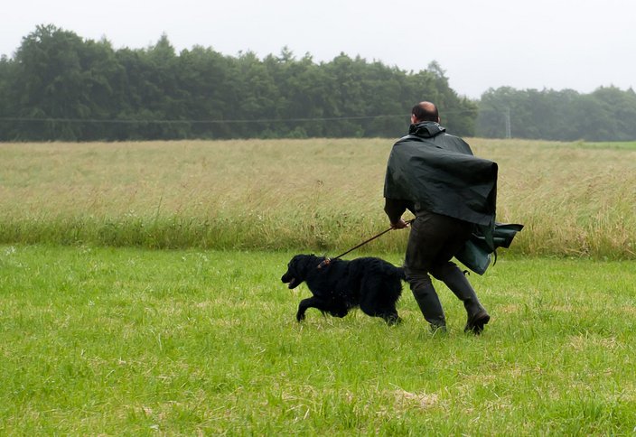 Im strömenden Regen wurde an diesem Abend fast ausschließlich am Feld gearbeitet. Und zwar so, wie es auch an der Prüfung aussehen soll. Schleppen, aber nicht mehr an der langen Leine sondern frei. Das allgemeine Resultat war bei diesem Fach recht gut, alle Hunde haben gebracht. Bei der Prüfung darf der Führer die ersten 20 m der Schleppe an einer Leine arbeiten, dann muß er den Hund ablaufen lassen und stehen bleiben.