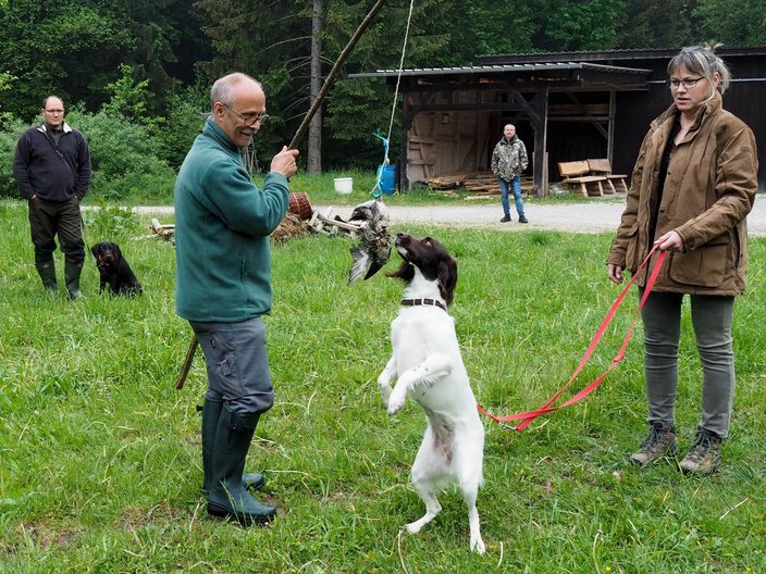 Wieviel Interesse haben unsere Hunde überhaupt am Wild? Diese Frage konnte mit einer Ente an der Reizangel von den Hunden schnell geklärt werden: je nach Charakter und Rasse vom herzhaften Zubeißen bis zum vorsichtigen Beschnuppern - Interesse war da.