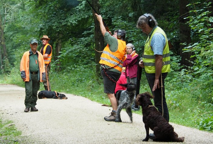 Die 3 Schwerpunkte für den neunten Tag des Hundeführerlehrgangs waren: das Standtreiben, die Leinenführigkeit im Stangenholz und der Gehorsam im Feld - d.h. wegschicken und wieder herrufen. Alle 3 Punkte wurden prüfungskonform geübt.