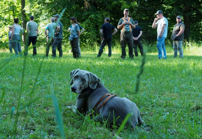 Allgemeiner Gehorsam, sauberes Apportieren - mit richtig Vorsitzen und Ausgeben -, Wegschicken und Herrufen, Verlorensuche und Leinenführigkeit im Wald - all das wurde beim achten Übungsabend ausgiebig geübt.