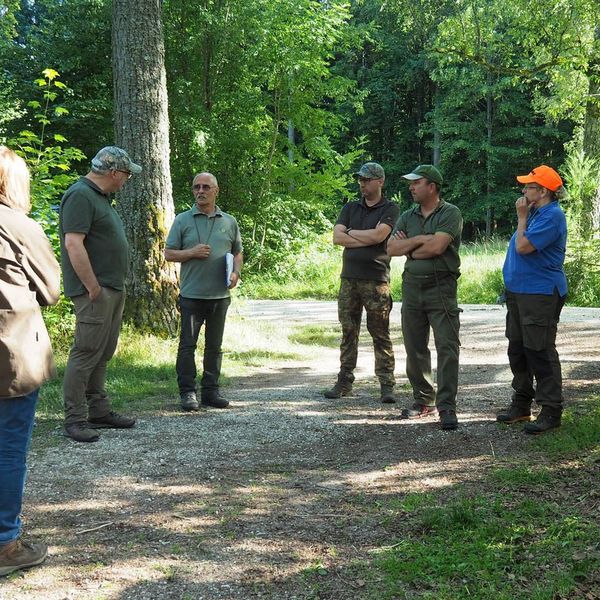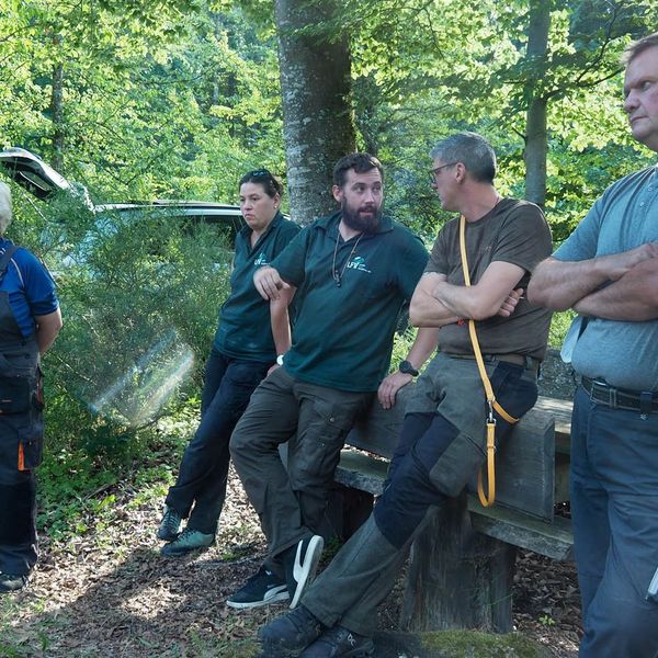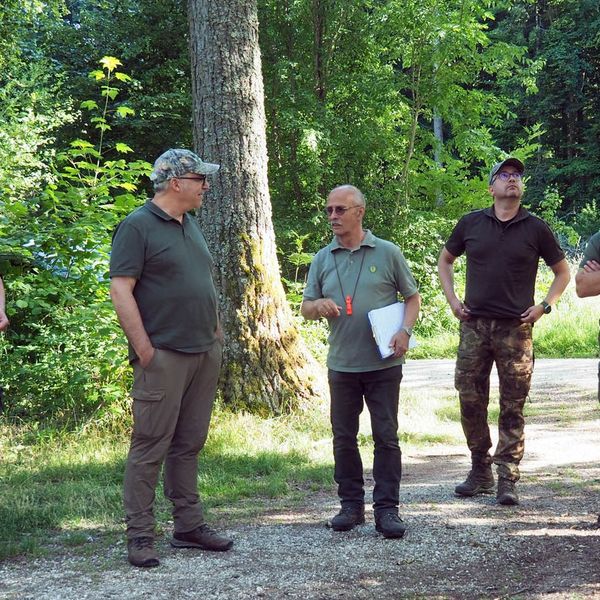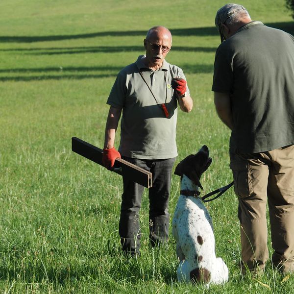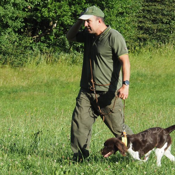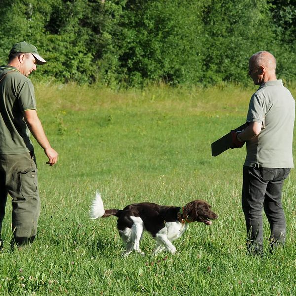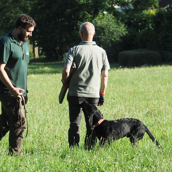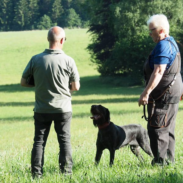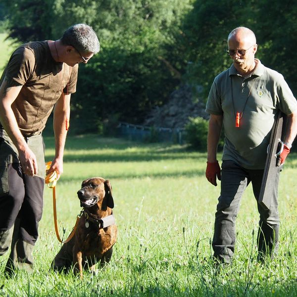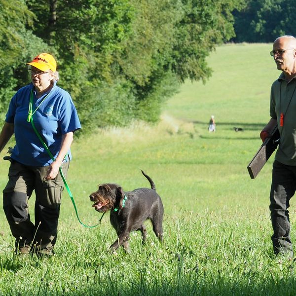 Der Hundeführerlehrgang 2023 ist auf der Zielgeraden: in 14 Tagen, am Samstag, 22.Juli, ist die Prüfung, bei der die Teilnehmer ihre Jagdliche Brauchbarkeit beweisen können müssen. 12 Gespanne nehmen daran teil, neun im Modul 1.1 - Nachsuche im Schalenwildrevier und drei im Modul 1.2, der erweiterten Brauchbarkeit in Feld Wald nach dem Schuss. Bis dahin hat jeder im Kurs drei Schweißfährten in Begleitung ausarbeiten müssen und die Einweisung zum selbst Legen von Fährten bekommen. Witterungsbedingte Ausfälle von Übungsabenden sind an Wochenenden und durch Zusatzterminen nachgeholt worden. Deutlich merkbar ist auch mit den Hunden zu Hause geübt worden. Der allgemeine Leistungsstand ist also bei fast allen gut – oder zufriedenstellend. Die noch kommenden Abende sind für Wiederholungen des Gelernten und zur Festigung, vor allem des Gehorsams.