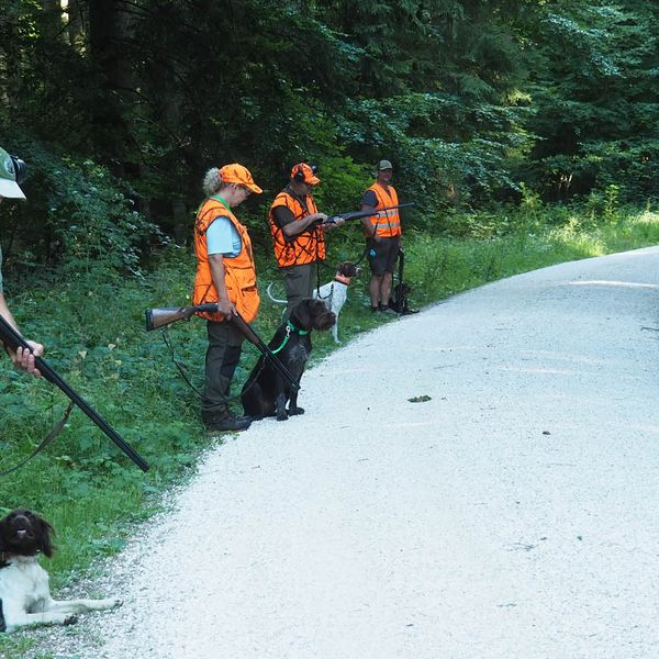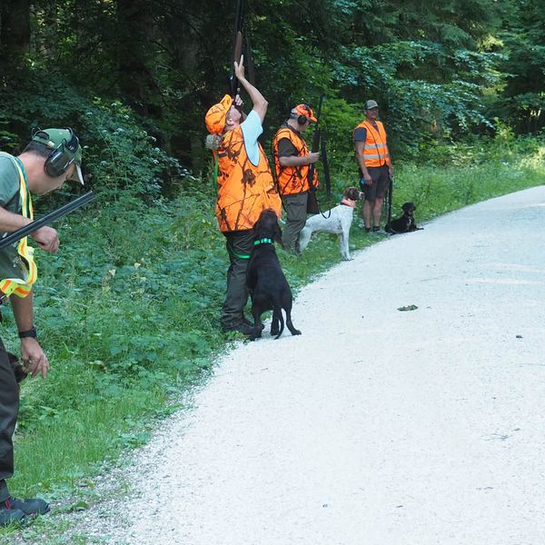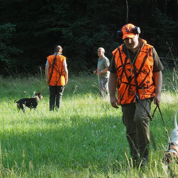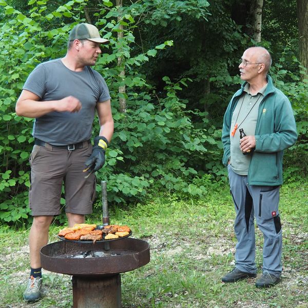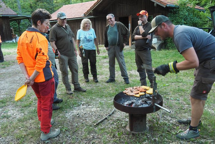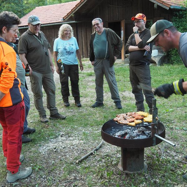 Am vorletzten, 12. Übungsabend des Hundeführerlehrgangs, bei der Jägerackerhütte, wurde das Standtreiben in Schutzkleidung, mit Waffe und Schüssen, noch einmal ausgiebig geübt. Ebenso das Wegschicken und, auf Kommando wieder Herrufen des Hundes. Beide Übungen verliefen durchaus zufriedenstellend. „ Wenn es bei der Prüfung so klappt, sehe dabei ich keine Schwierigkeiten!“ so Hundeobmann Martin Schietinger. Den Rest des Abends saß man in geselliger Runde beieinander, bei lockeren Gesprächen, die sich nicht nur um die Prüfung drehten. Harry Fetzer legte gekonnt Leckeres für alle auf den Grill, Getränke gab es wie immer in der Hütte. Es wurde spät! Durch die vielen Stunden gemeinsamer Arbeit mit den Hunden, sind sich naturgemäß auch die Führer näher gekommen. Und bald sieht man sich nicht mehr so häufig! Es war einfach ein schöner Abend beim Hundekurs 2023.