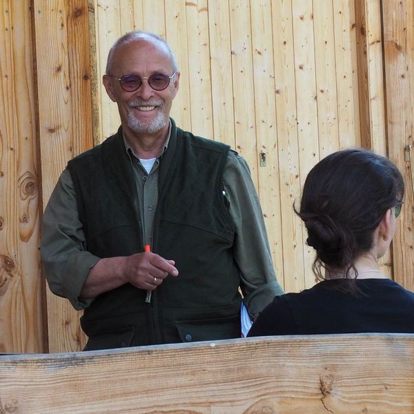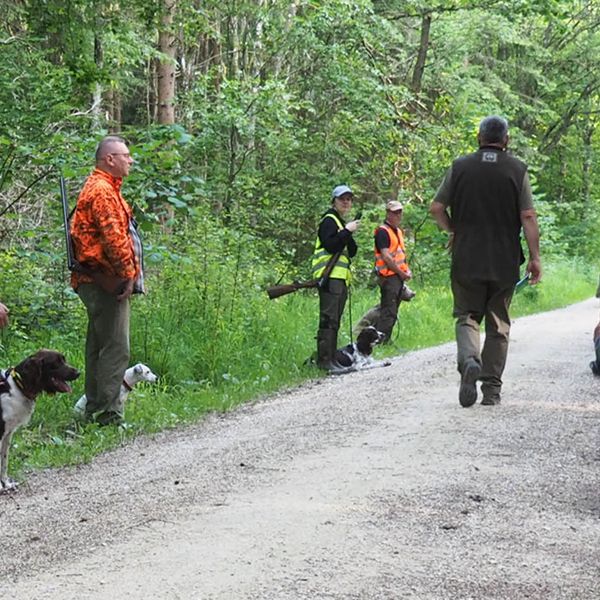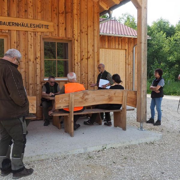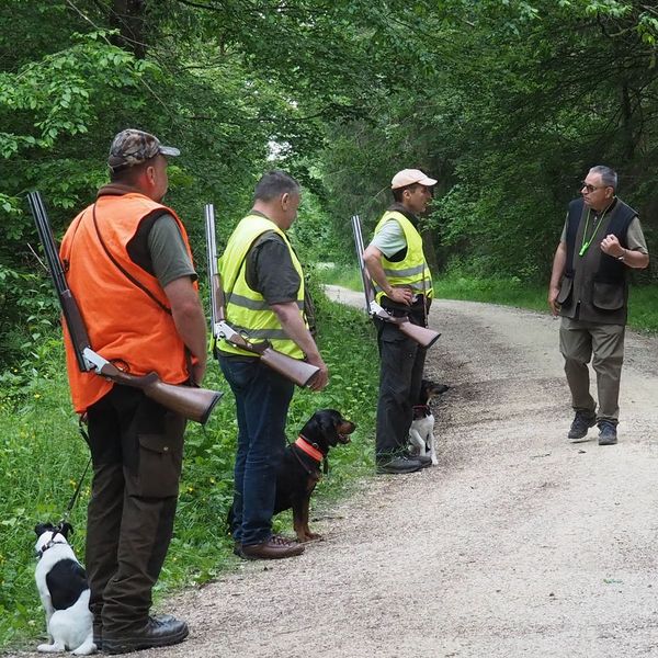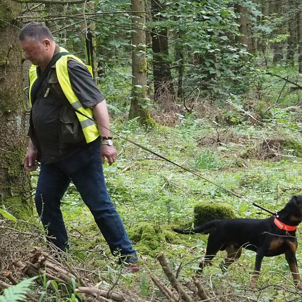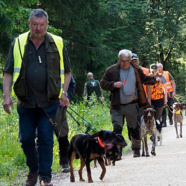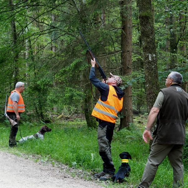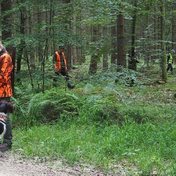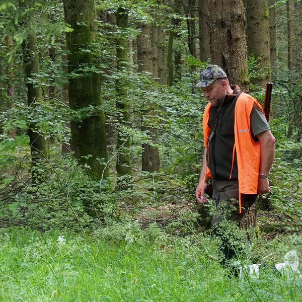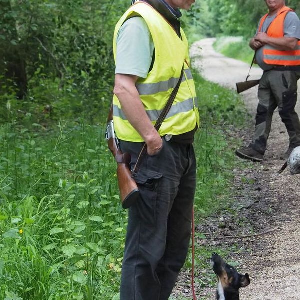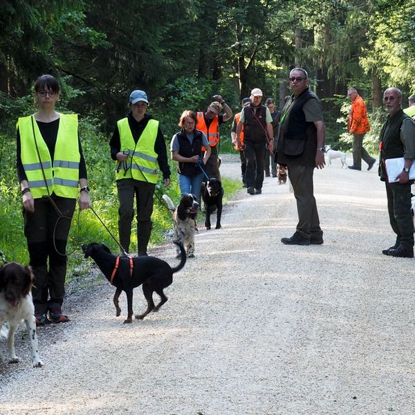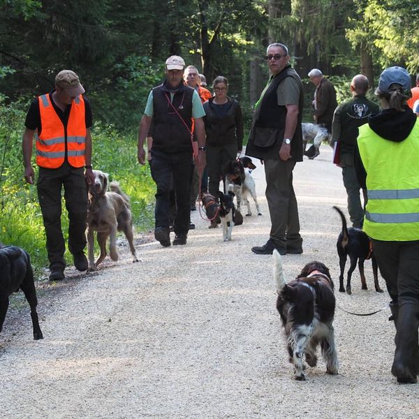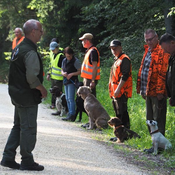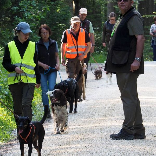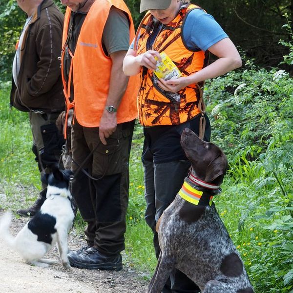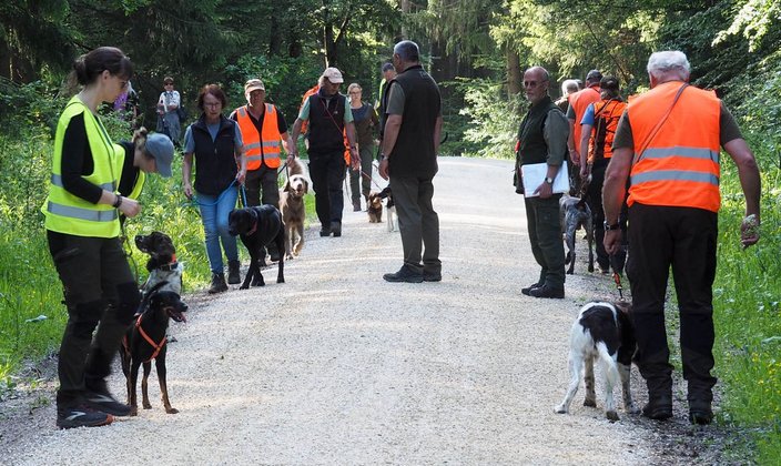 Um bestens vorbereitet zu sein, wurden an diesem Übungsabend Standtreiben und Leinenführigkeit im Stangenholz unter realen Bedingungen geübt – mit Schutzkleidung und Waffe, genauso wie es auch bei der Prüfung der Fall sein wird.