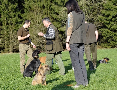 Der zweite Tag des Kurses war voll und ganz der Schweißarbeit gewidmet. Ist sie doch ein wichtiger Teil der Praxis für unsere Jagdhunde. Auch für diese Arbeit ist die Unterordnung ein unerläßlicher Grundstein und wurde wieder am Anfang des Abends geübt.