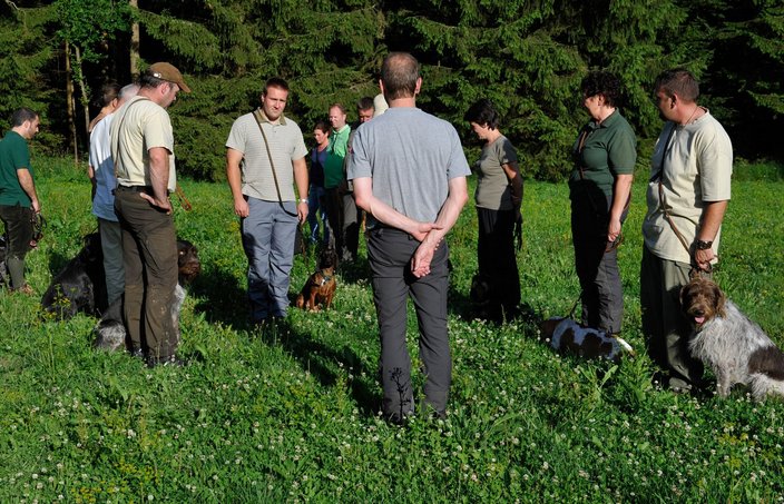 Vorletzter Tag vor der Prüfung beim Hundekurs 2014. Nocheinmal das volle Programm: Schweißfährten, Unterordnung, ausgiebig und einzeln auch noch einmal die Leinenführigkeit im Stangenholz und nicht zuletzt die Schleppe mit Wild auf dem Feld.