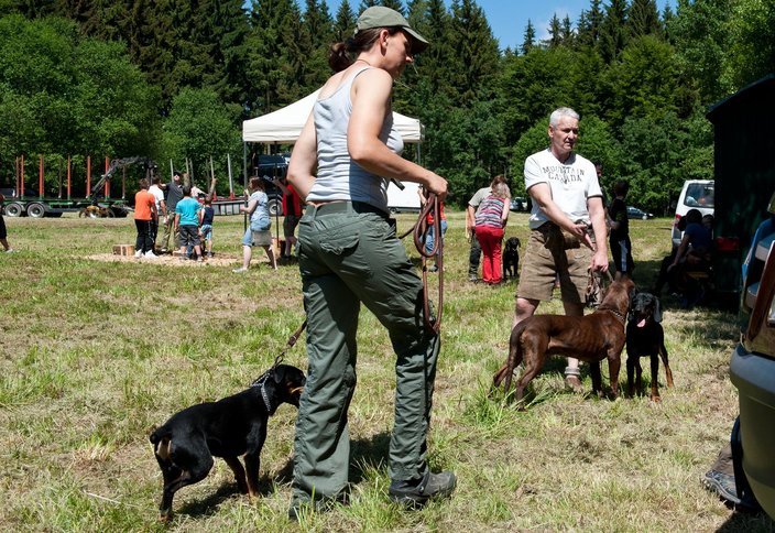 Trotzdem stellte Hundeobmann Kai Bubeck den wenigen interessierten Besuchern die einzelnen Jagdhunderassen vor, vom Erdhund über den Schweißhund zum Vorstehhund und erklärte ihren Einsatz bei der Jagd. Fast von jeder Rasse konnte dabei ein Hund präsentiert werden.