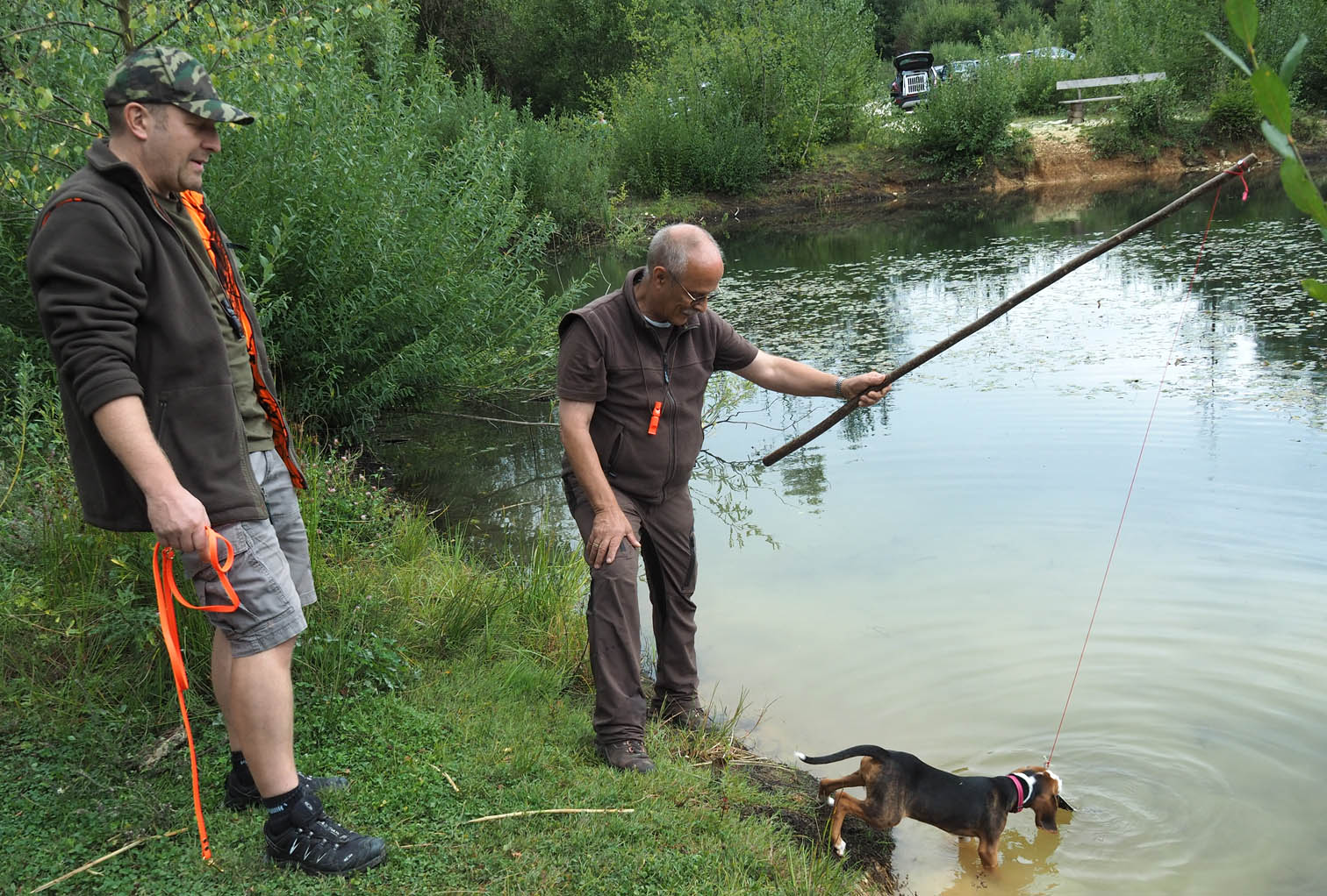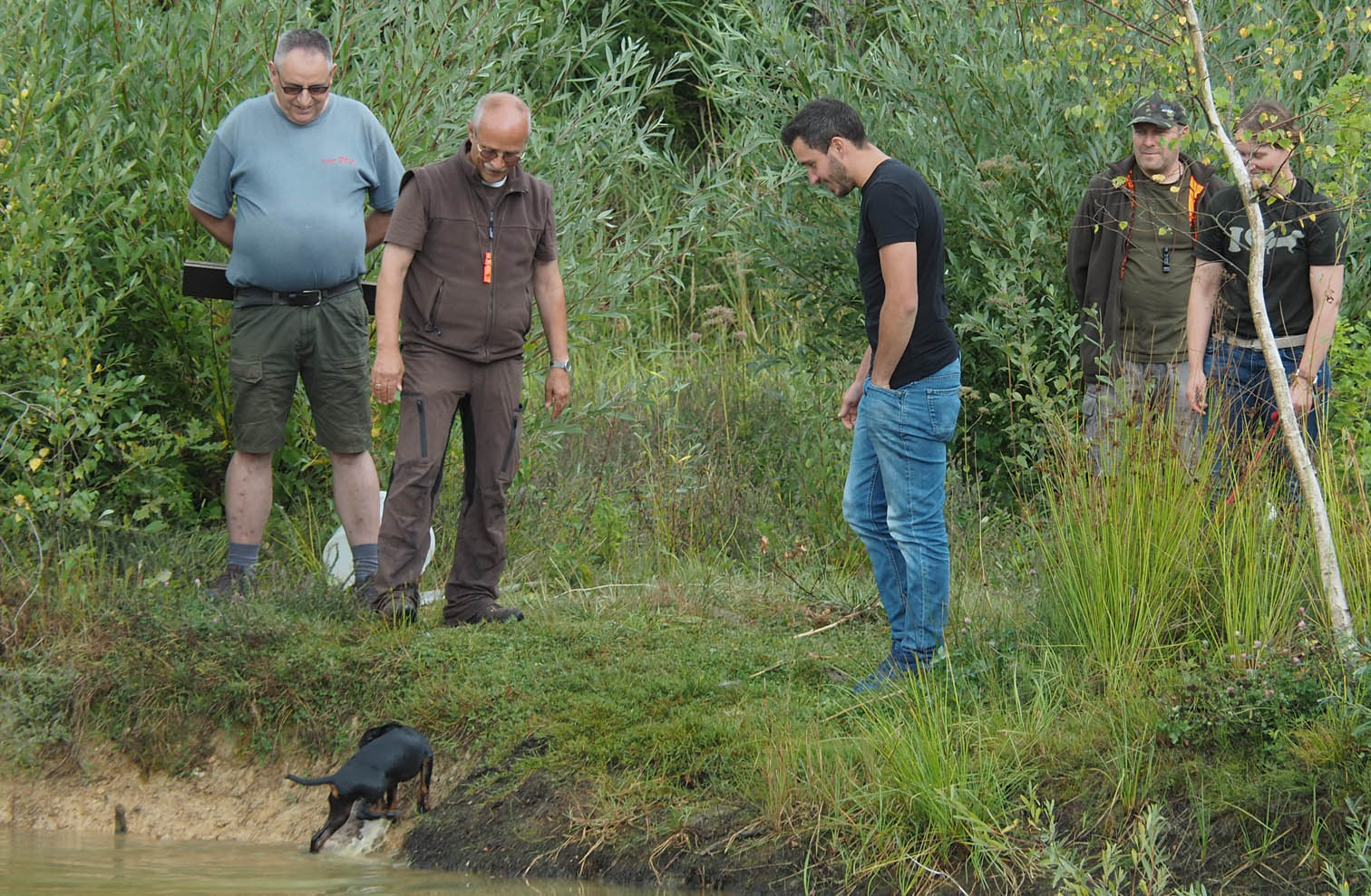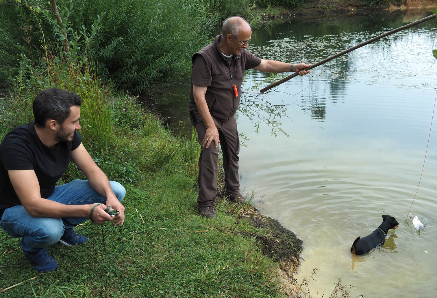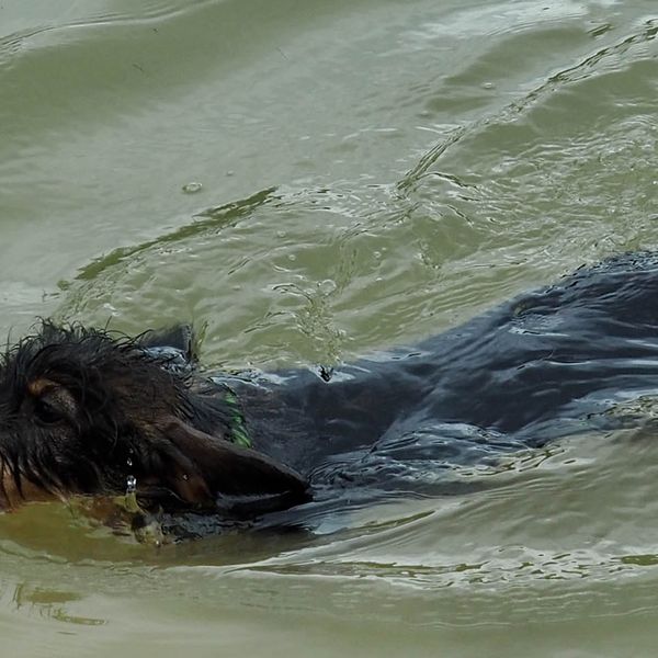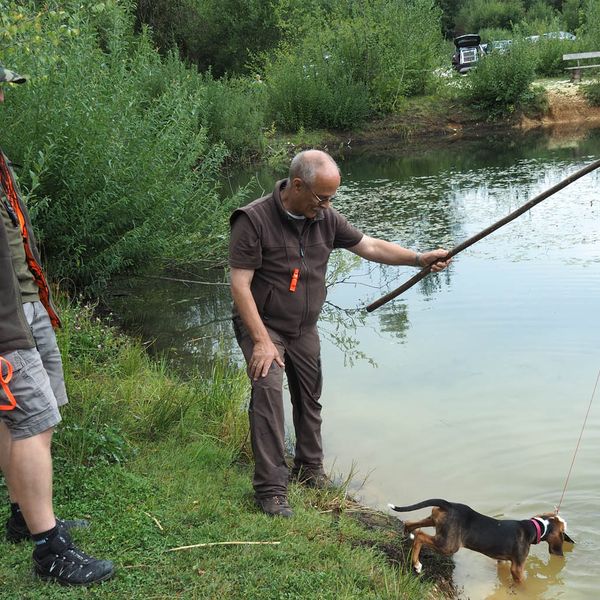 Beim letzten Tag des Welpenkurses 2022 auf dem Ochsenberg ging es um die Wasserfreudigkeit der jungen Hunde. Sie konnte unterschiedlich nicht sein. Während sich der eine Welpe nur zögerlich die Pfoten benetzte, zog die Neugier den anderen mit der Reizangel ganz hinein ins kühle Nass.