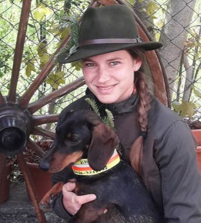 Die zweijährige Kitty hat 2020 die Brauchbarkeitsprüfung bei der KJV Heidenheim in beiden Modulen mit sehr gut bestanden und war bei der Spurlautprüfung im Oktober in Birkhausen beim DTK Tagessieger mit 1.Preis.