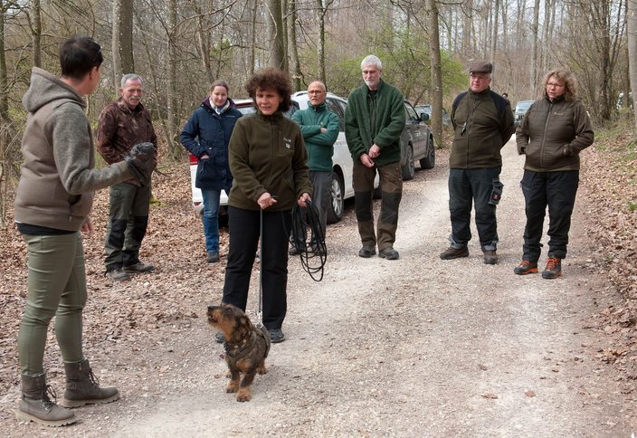 Danach zeigte ein kleiner Rauhhaardackel Rüde, wie Mantrailing in der Praxis funktioniert: er fand in kurzer Zeit und ohne Umschweife sein im Gebüsch verstecktes Herrchen wieder und war über die Belohnung dafür außer Rand und Band.