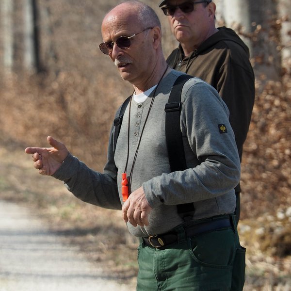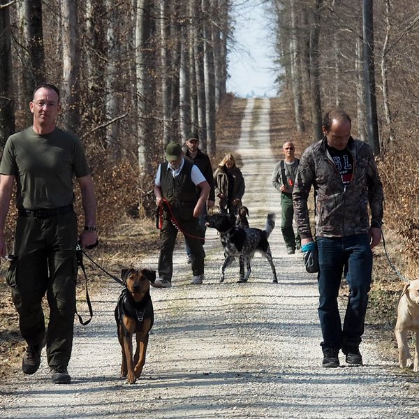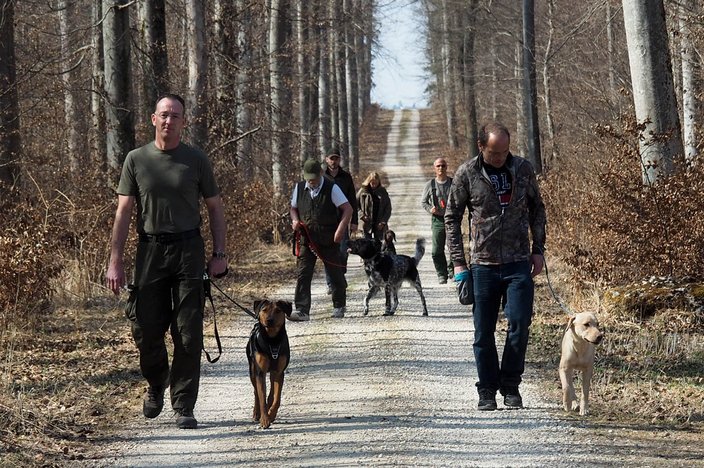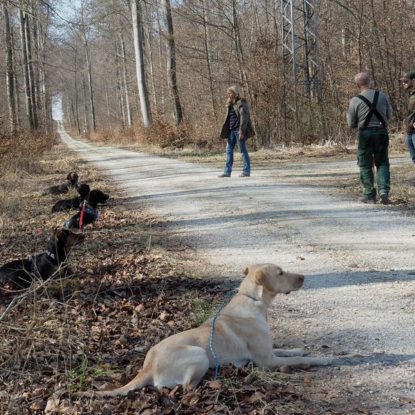 Leinenführigkeit, Sitz, Fuß, Platz, Abliegen über längere Zeit, Wegschicken und Wierherkommen - Übungen an diesem Frühlingstag beim Jägerhäusle, bei denen jeder Führer selber sehen konnte, wie es damit bei seinem Hund bestellt ist. Nicht alles, was bei Einzelübungen im "stillen Kämmerlein" geklappt hat, funktionierte bei der Ablenkung durch die Meute genauso gut. Grundsätzlich aber hat jeder ernsthaft mit seinem Hund in den letzten Monaten gearbeitet - wie Martin Schietinger erfreut feststellen musste!