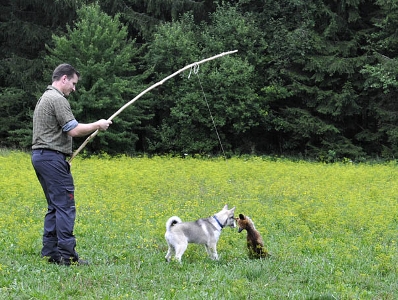 Der Fuchs an der Reizangel war die nächste Herausforderung. "Ist ein Hund raubzeugscharf, dann ist er auch wildscharf!" so Bubeck, "umgekehrt kann man das nicht sagen." Für die meisten der Welpen war der schnelle Fuchs ein sehr interessantes Objekt.