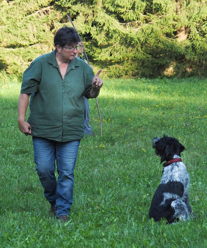 Freies Spiel auf der Wiese, das eigentliche Kennenlernen der kleinen Meute, wurde ja nach Temperament von allen Welpen freudig aufgenommen. Aber nicht nur das Spielen, stand für diesen ersten Abend auf dem Plan, sondern auch bereits die ersten Übungen. So unter anderem das Herrufen aus der Gruppe, Sitz, Steh, Platz, das Führen an der Leine und auch die ersten Reize mit einer Rehdecke an der Angel wurden spielerisch geprobt. Als Vorbereitung auf den Ernst des Jagdhundelebens, bei dem Gehorsam an erster Stelle steht.
