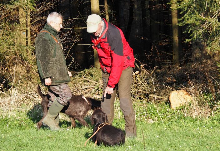 "Auf der Schweißfährte gibt es nur zwei Kommandos: `Such verwund` beim Ansetzen und `Zur Fährte`wenn er von dieser abkommen sollte!" erklärte der Hundeobmann eindringlich. Zu viel reden stört den Hund und kann beim etwaigen Loben sogar kontraproduktiv sein.
