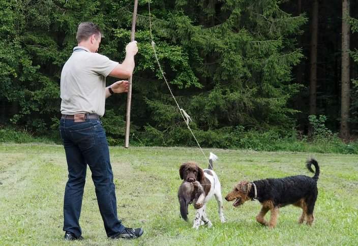 Raubwild war danach aber das Thema des Abends. Ein Fuchs, und später ein Marder an der Reizangel von Hundeobmann Kai Bubeck, weckten das Interesse bei allen Hunden. Je nach Temperament ging man vorsichtig oder stürmisch darauf los, versuchte das "stinkende Tier" zu fangen oder sogar zu beuteln. Jedes Interesse wurde dabei ausgiebig gelobt.