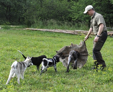 Aber auch eine Hasenschleppe wurde spielerisch "gearbeitet". Ebenso konnten die kleinen Gesellen an einer Sommersauschwarte ziehen und zerren und der Ente an der Reizangel hinterher hetzen, während im Hintergrund immer wieder mal ein Schuss abgegeben wurde.