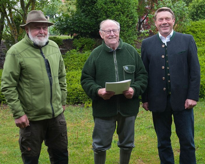 Heinz Elser ist seit 55 Jahren Mitglied bei der KJV Heidenheim, ein erfahrener und umsichtiger Jäger, der, wie Stütz und Junginger betonten: "allen jungen Jägern als Vorbild dienen sollte!"