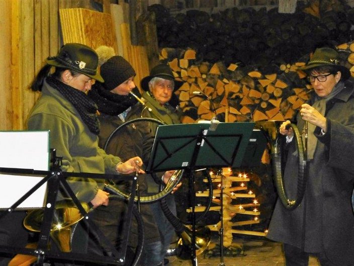 Am 16. Dezember gaben unsere Bläserinnen und Bläser dem vorweihnachtlichen Adventsfenster in Dettingen eine ganz besondere Note. Zum schon seit einigen Jahren gelebten Brauch in der Adventszeit abendliche Treffen abzuhalten um ungezwungen miteinander zu singen und besinnliche Geschichten zu lesen traf mach sich an diesem Abend bei Familie Schuh. Trotz der nass-kalten Witterung nahmen viele Besucher die Einladung an und gesellten sich zu der bunt gemischten Gesellschaft im Hof der Kirchgasse 4. Die vielen Kerzen der weihnachtlichen Dekoration, die dazu passenden Klänge unserer Parforcehörner, die Geschichte der Kerze, die sich freut Licht und Wärme zu spenden obwohl sie dabei immer kleiner wird, das humorvolle Gedicht von der Weihnachtsmaus und die von Alt und Jung gemeinsam gesungenen Weihnachtslieder erzeugten eine stimmungsvolle Atmosphäre.